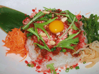 安全性にこだわった飼育法で育てた十勝牛のフレークを熱いご飯にのせ、独自のたれをかけました。もやし、ほうれん草、にんじん、ノリなどで、色と味の絶妙なバランスをお楽しみいただけます。 |